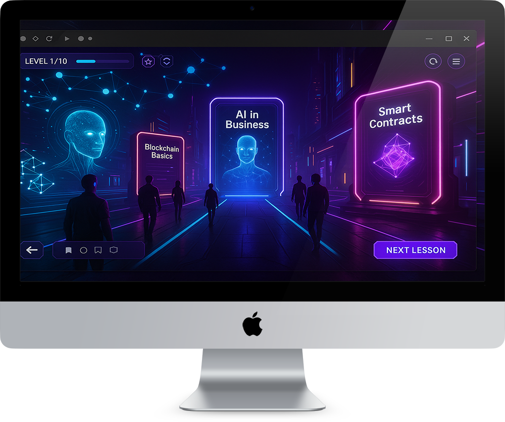 A futuristic learning hub where complex subjects like blockchain, AI, Web3, and cybersecurity are taught through immersive 3D walkthroughs, challenges, and gamified modules.