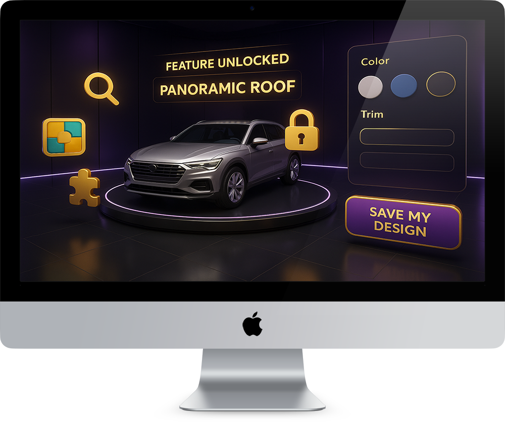 An immersive 3D product configurator with gamification features. Customers interact with products in a playful way—unlocking hidden features, exploring variations, and being rewarded for engagement—making sales journeys memorable.